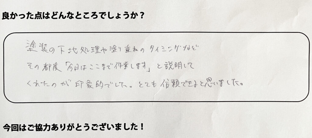 塗装の下地処理や塗り重ねのタイミングなど、その都度「今日はここまで作業します」と説明してくれたのが印象的でした。とても信頼できると思いました。