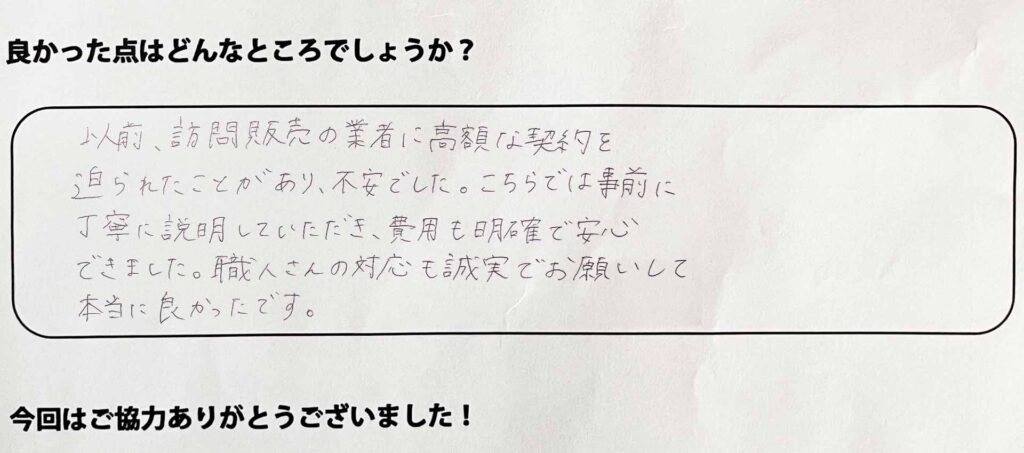 以前、訪問販売の業者に高額な契約を迫られたことがあり、不安でした。こちらでは事前に丁寧に説明していただき、費用も明確で安心できました。職人さんの対応も誠実でお願いして本当に良かったです。